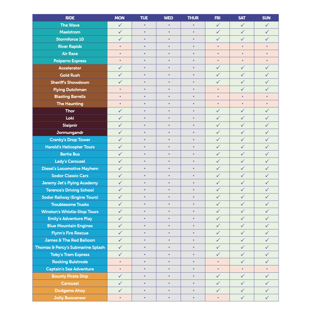 Planning your visit? Use the table below to find out which rides will be running between 3rd - 24th October.