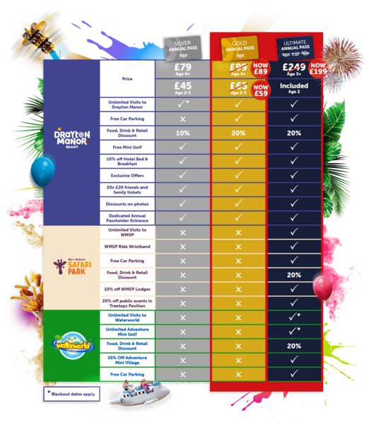 • Under 3's can visit Drayton Manor & West Midlands Safari Park for free alongside a valid Ultimate Annual Passholder. A ride wristband will need to be purchased separately for under 3's at West Midland Safari Park.